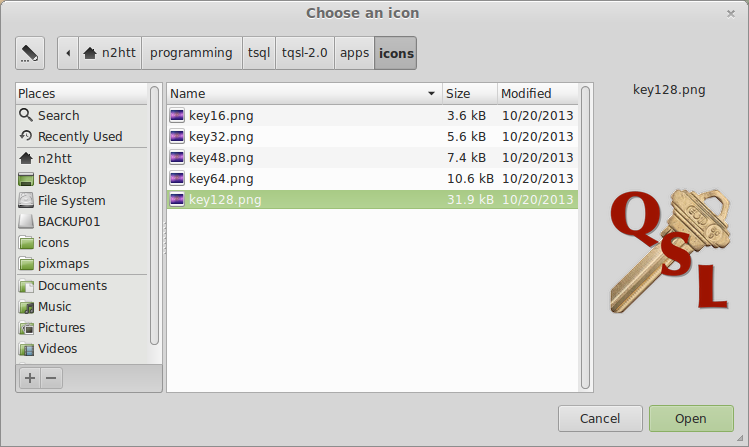 I wanted to have an “official” icon for tqsl show up in the menu, so I browsed around the tqsl installation looking for icon files, and I found them. I selected the largest one and added it to menu entry I created earlier.
