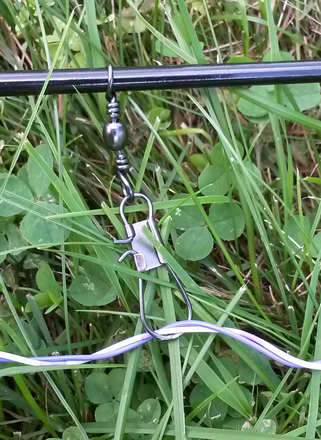 The crappie pole can be used in a variety of ways. You can attach the end of the wire to the top of the pole, for a vertical or a sloper, or you can run the midpoint of the wire over the top of the pole to get an inverted vee configuration. I use a large fishing swivel snap to attach the wire to the pole. The eyelet of the snap goes over the pole tip and slides down until it is snug. You lose a little altitude, maybe a foot or so, but the pole is stiffer at this point and less prone to bending under the tug of the wire. You can attach the end of the wire to the swivel, or just run it through for the inverted vee setup. Here’s what that looks like: