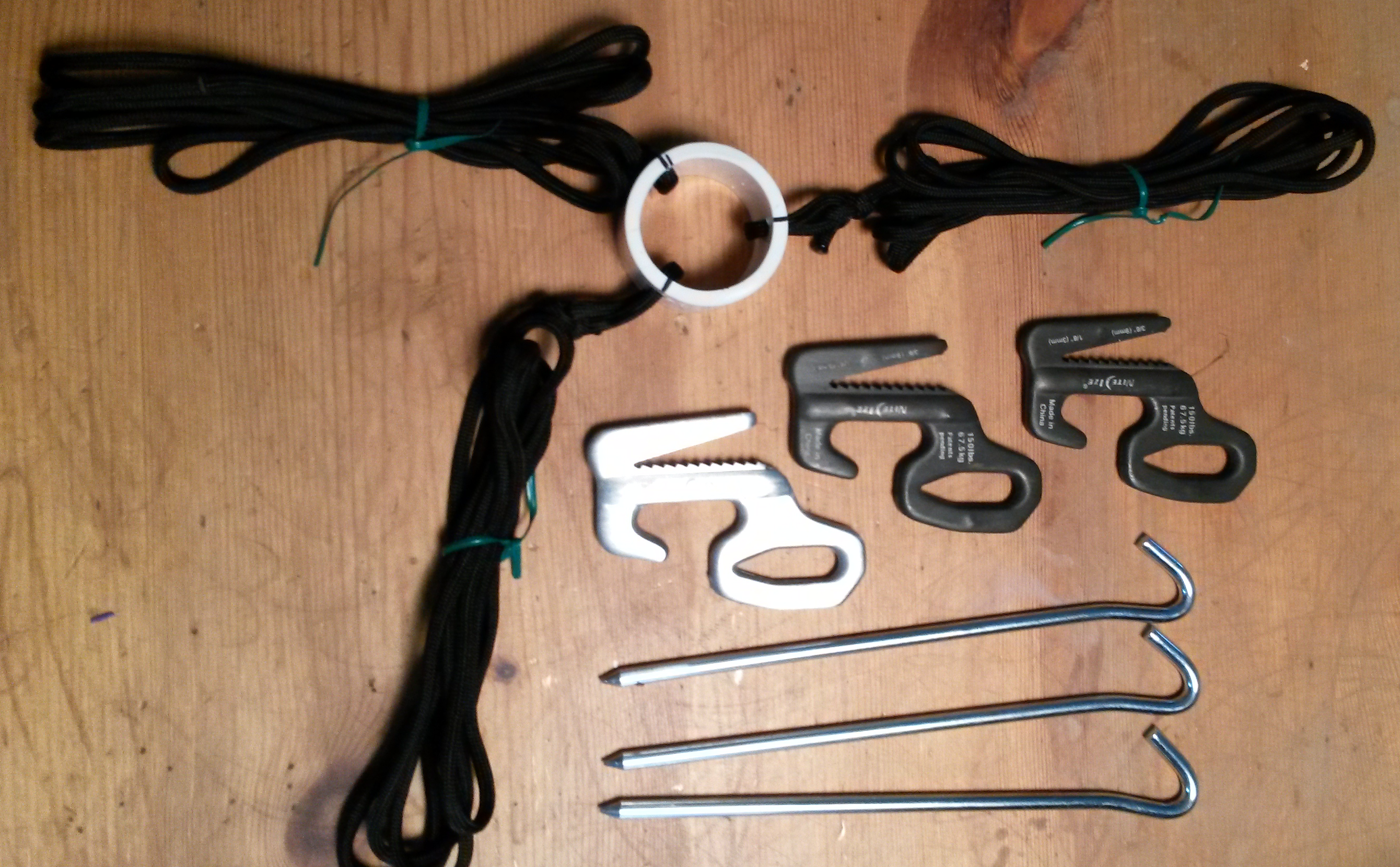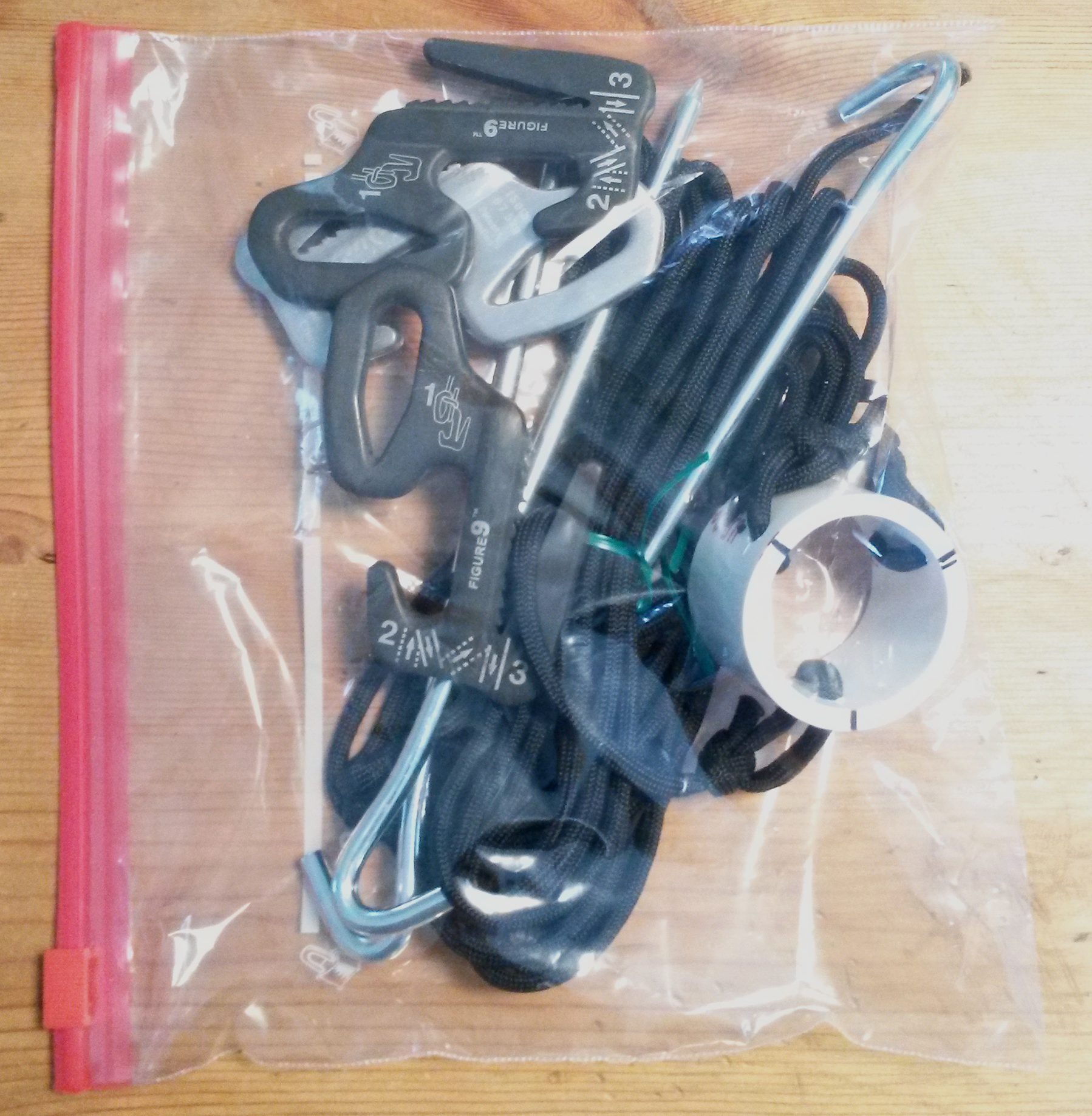 The kit consists of a section of pvc pipe, three lengths of para cord, three mini tent stakes, and three line tighteners sold by Nite-ize, called Figure 9s. The line tighteners are an indulgence; if you can reliable tie a taut line hitch you can do without, but unless I am facing in the correct direction with respect to the line and there is no wind, I always screw that knot up. Here’s what it looks like deployed:
