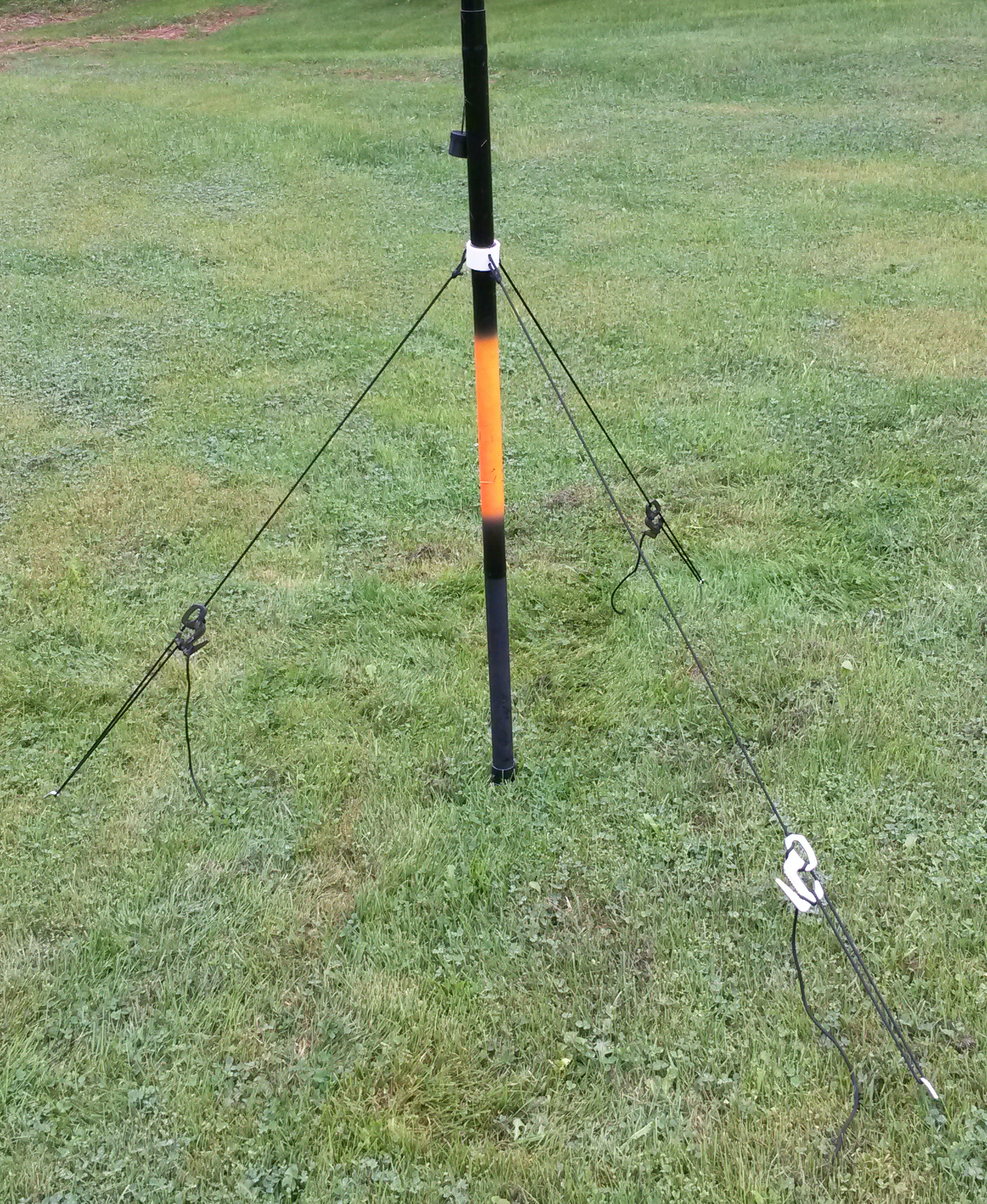 So the antenna doesn’t cause much of a bump in the backpack, but then there is the support. Basically the strategy is to use available trees, if any, along with some portable support you carry along for those occasions when no convenient trees present themselves. For this purpose, I use a 20 foot telescoping fishing pole, called a “crappie pole”. The whole thing weighs a pound or so, collapses to a 4 foot length that can easily be mistaken for a walking stick, and sets up in seconds. The challenge is how to support it in a vertical position.