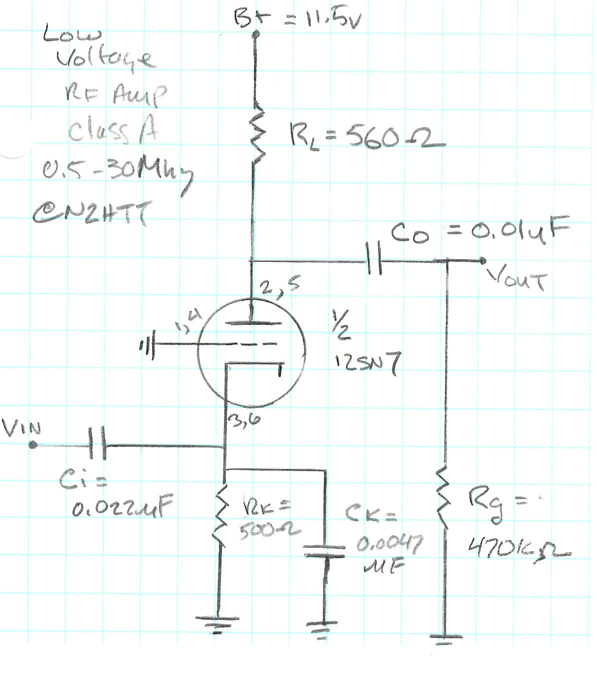 I have found a space change pentode, a 12EZ6, that is made for use with 12 volts on the plate. Looking at the curves and data for the tube, I will be working smack in the middle of the design domain instead of on the fringe. I found a couple on eBay for about $3 each, and while I am waiting for them I can try to figure out the circuit for a pentode. It’s a bit more complex, and I may try to use a choke instead of a resistor to couple the output, since that reputedly works better for broad-band RF stages.