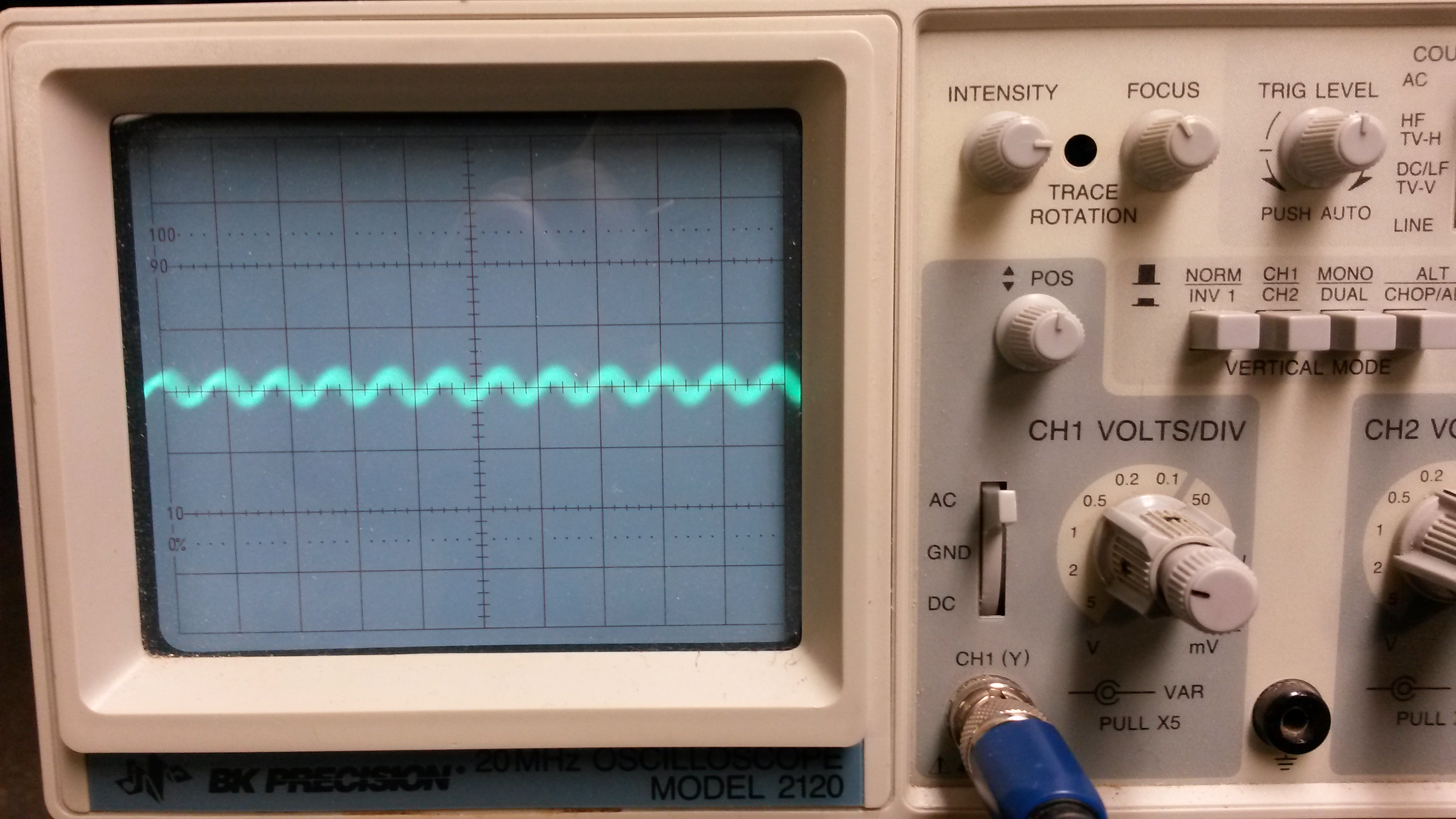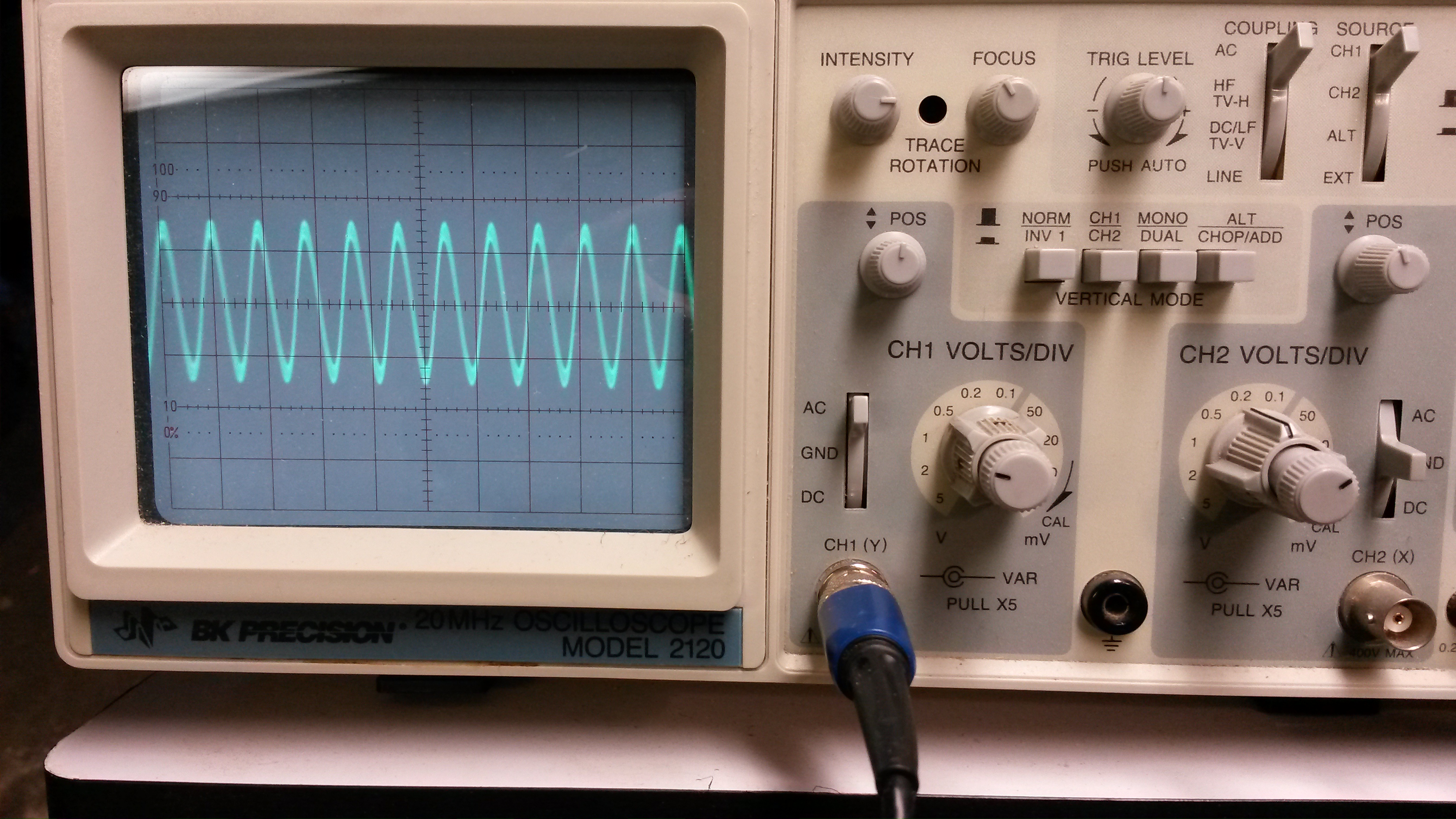 Triodes have a few pF of inter-electrode capacitance, in the case of the 12SN7 I think the total is about 5 pF. At audio frequencies this has a really large reactance, and very little signal leaks to ground through that path bypasses the plate resistance. However, at RF frequencies, that reactance drops to about 1 k ohm or less, and a lot of the signal is lost. To paraphrase “Hollow State”, that’s why triodes may lousy RF amplifiers, and you should use a pentode instead. I missed that on the first go through. Okay then, I should be able to test that hypothesis – I put the plate back to 12 volts, and set my signal generator to its lowest output frequency, around 85 kHz. Wow, output abounds. I replaced my load resistor with a 10k pot, and dialed it in to get unity gain – you can see the result here: