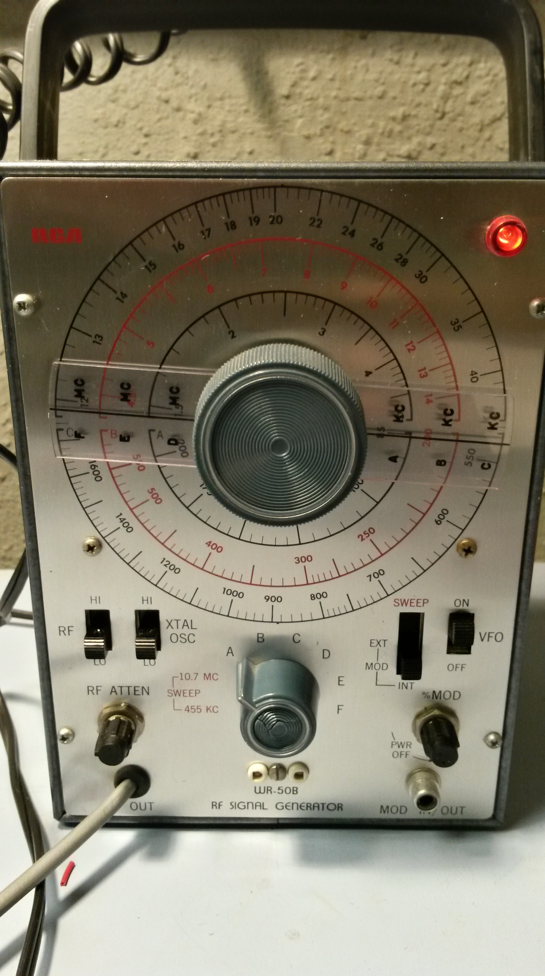I have a vintage RCA signal generator that I picked up at the Bring & Buy club auction a few years ago. Perfect for this application. I set it up for around 7 Mhz, and a 5 mv signal (about 40 over S-9, a really loud station) and tried again. You could barely see a little signal in the output, again way down. Despair began to creep in. What was I doing wrong?