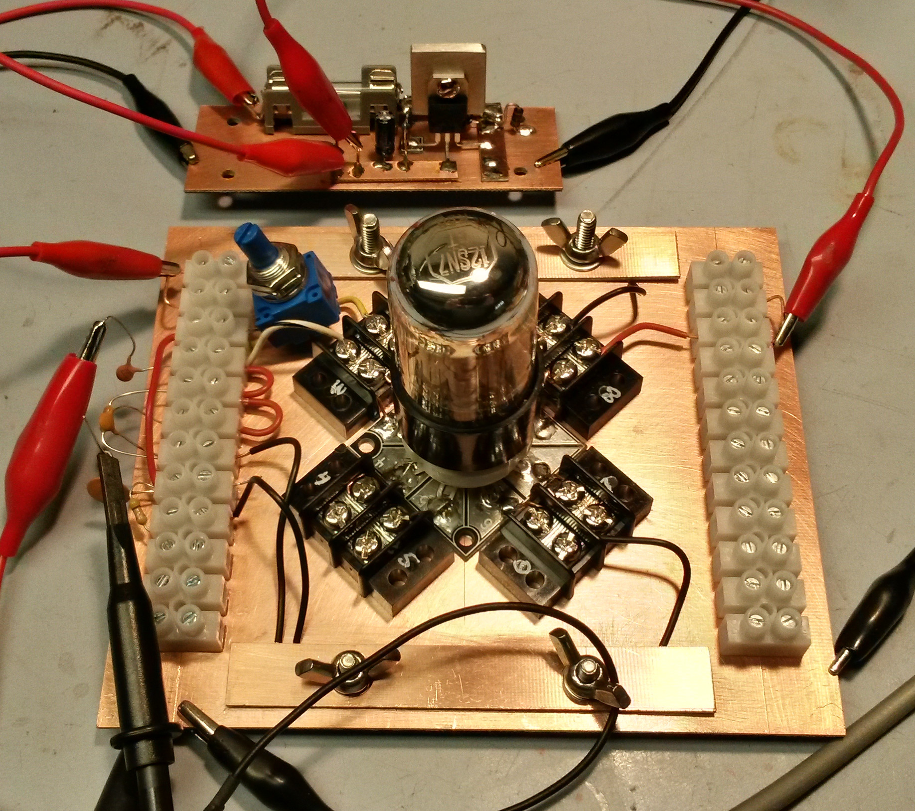 In order to test this circuit, I built a “breakout box” test bed for an octal tube base. This fixture allows me to make all of the connections by screw terminal, no soldering required. Also, I can separate the + voltage to the heater and plate, to allow trying higher plate voltages.