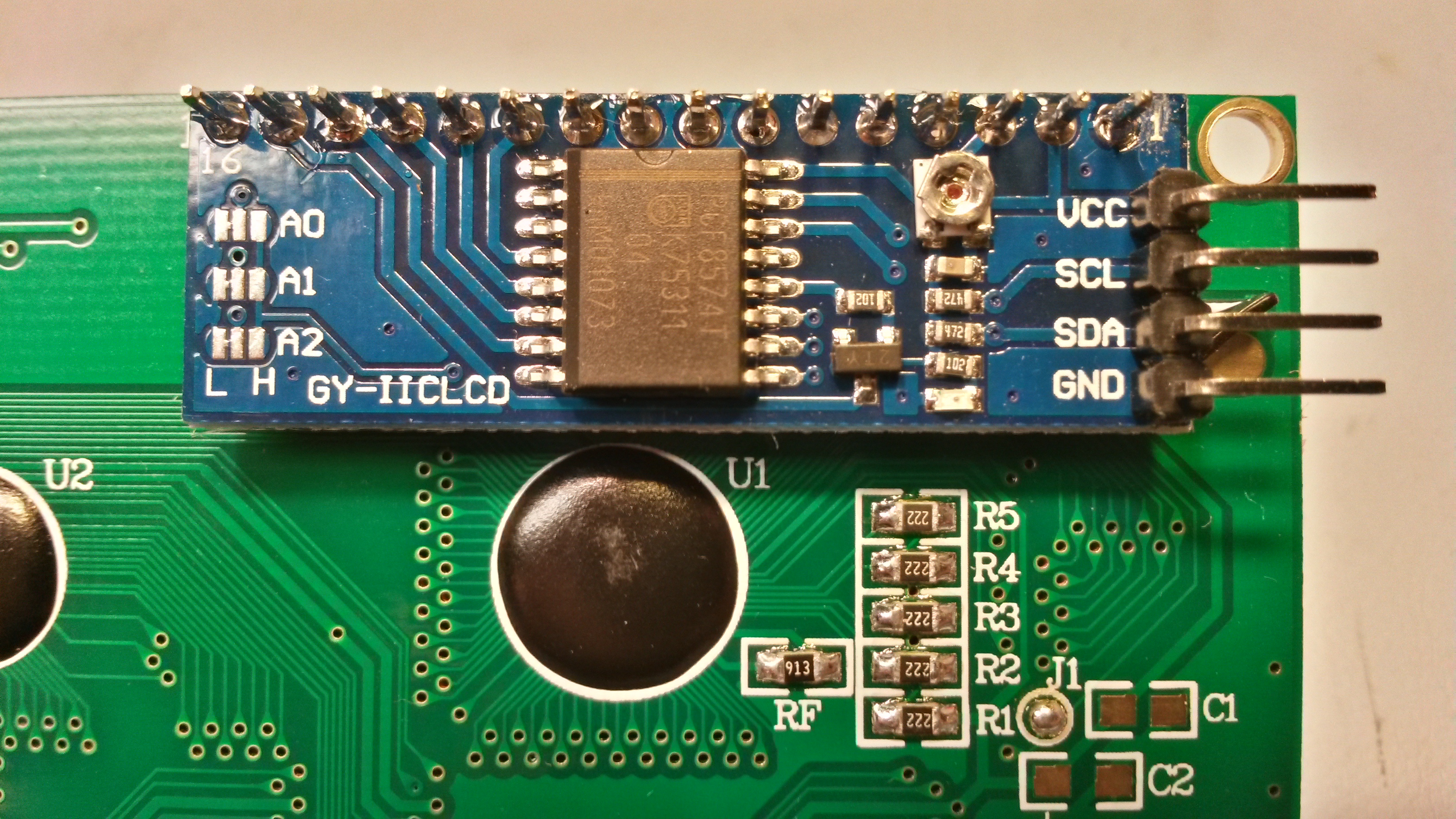 My backpack board(s) arrived surprisingly quickly. There was some simple assembly required: a 4 pin, 90 degree header gets soldered to the input pins of the backpack (Vcc, GND, SDA, SCL), then the backpack slips over the 16 pin header on the LCD display and is soldered in place. There is a tiny pot built into the board for a set and forget contrast setting. Quick, sturdy, and foolproof.